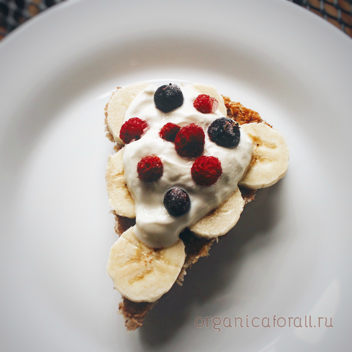 - Готовый пирог остудить. Украсить дольками банана, ягодами и любым кремом.