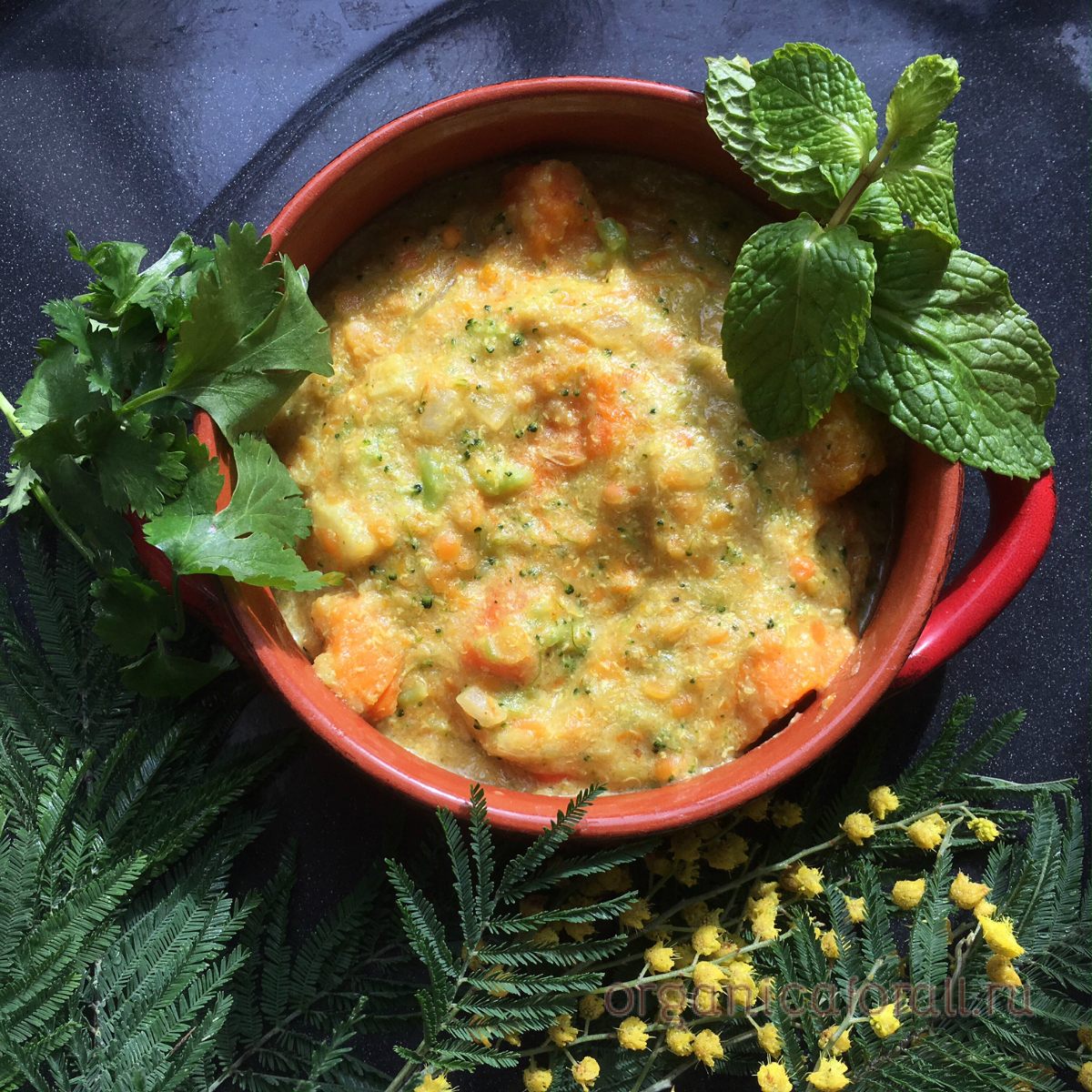 1. Нарезанные тыкву и батат (можно обычный картофель) насыпьте в кастрюлю, добавьте  кокосовое молоко, перемешайте и ставьте варить.