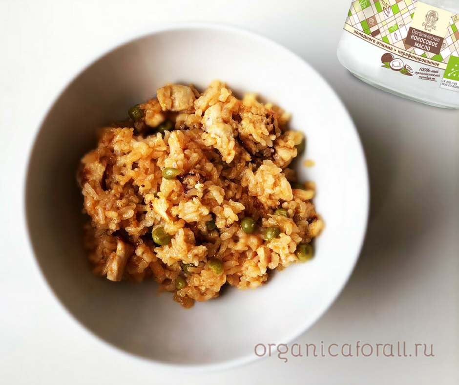- Выключите плиту, высыпьте на паэлью горошек, добавьте кокосовое масло, накройте крышкой и дайте постоять на горячей плите еще минут 5.