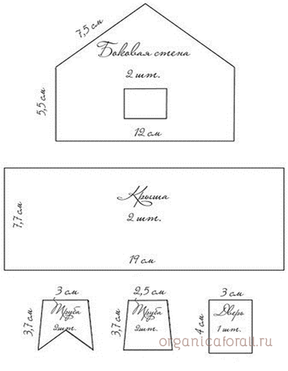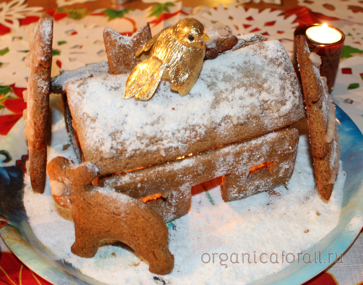 - Сверху посыпать домик сахарной пудрой. Можно вместо пудры использовать мед и украсить домик по вашему вкусу.