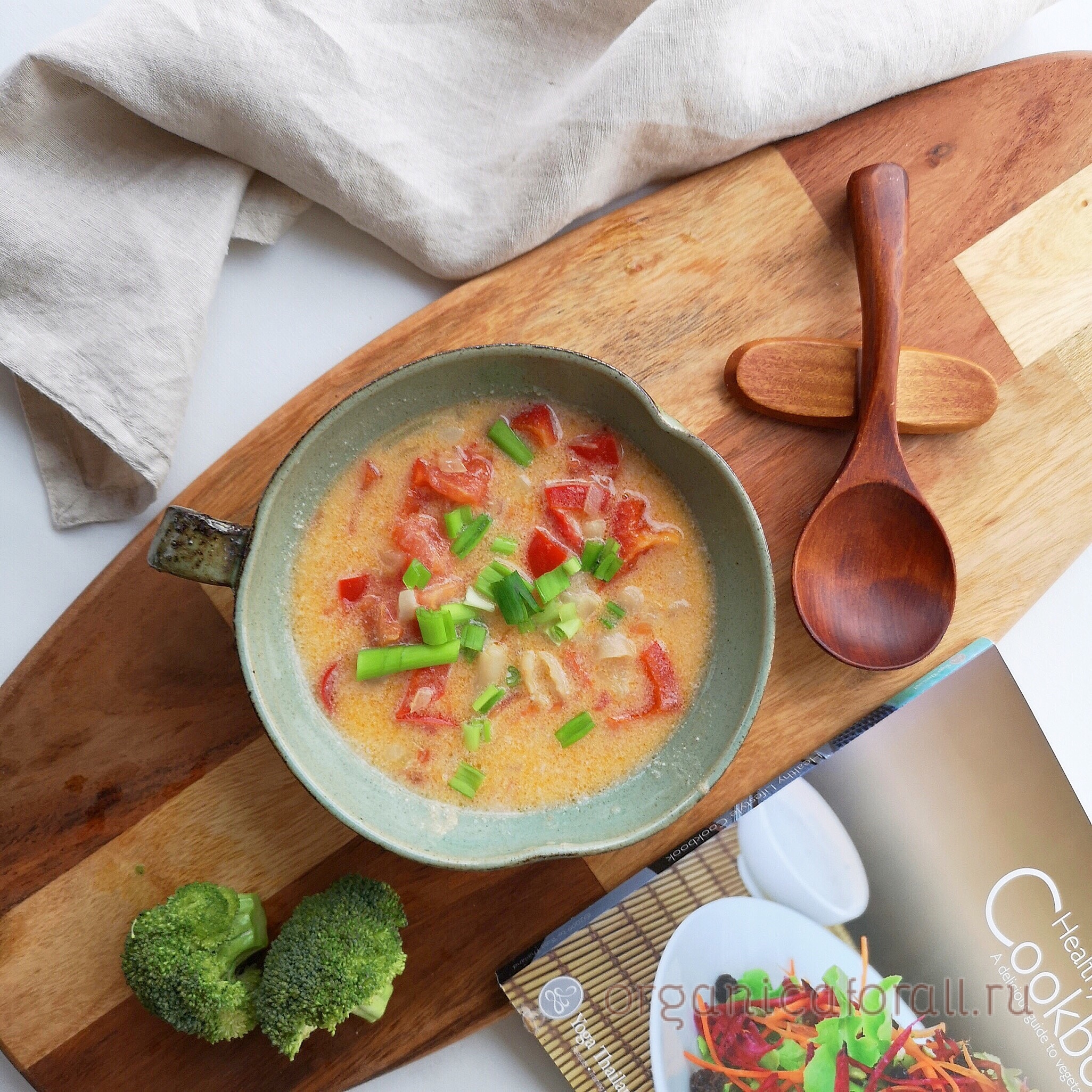 4. Влейте воду, добавьте бульонный кубик, фасоль и кокосовое молоко. Варите на медленном огне 10 минут.